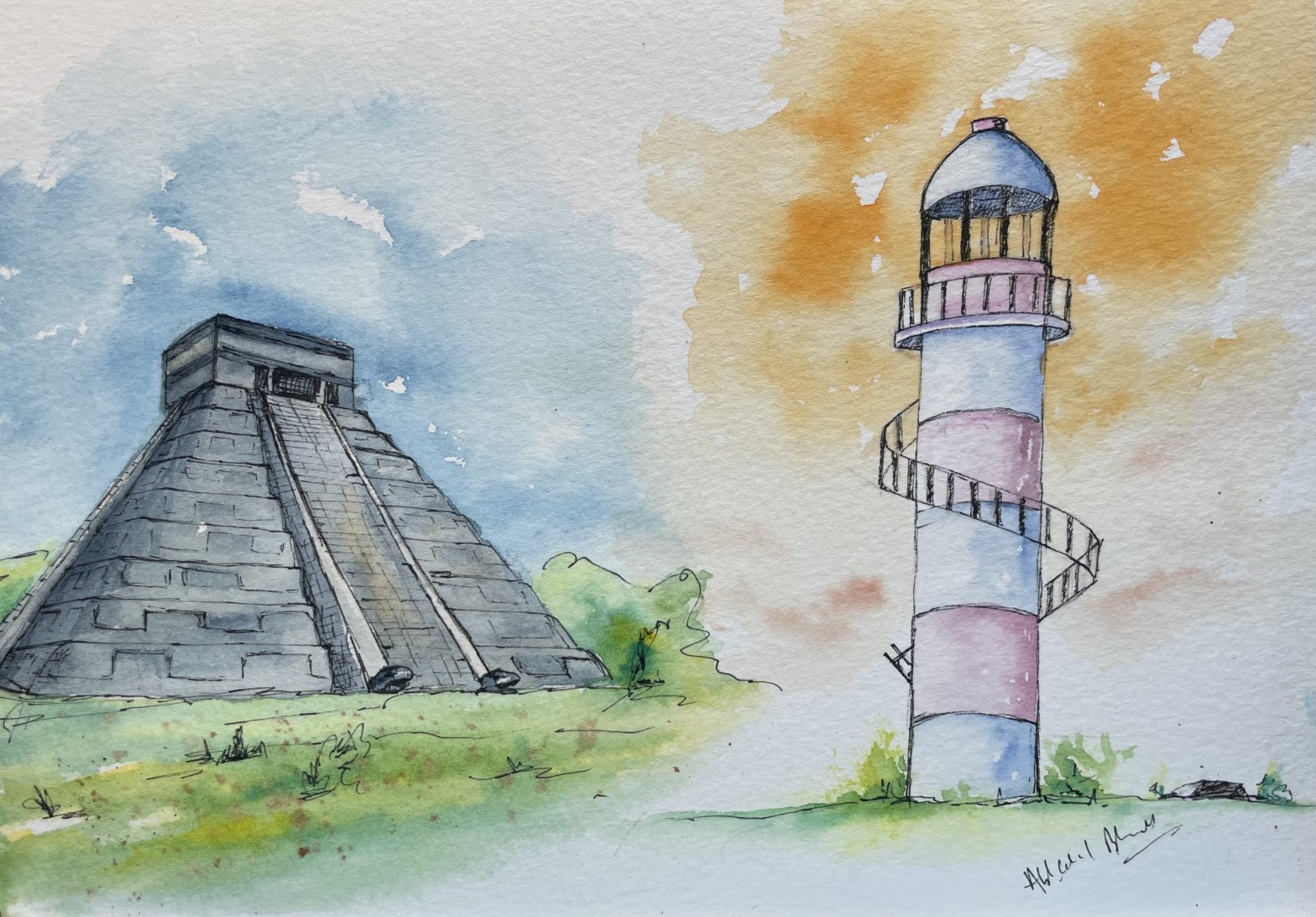 For the banyan tree, I began with a wash of raw sienna to establish the base color. To add depth and texture, I layered burnt sienna and permanent violet, giving the tree a rich, earthy feel.