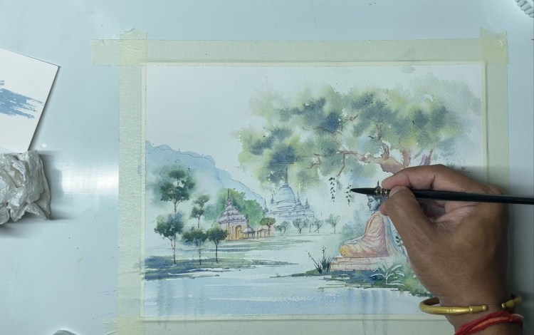 The foliage and the Bodhi Tree were painted using the wet-on-wet technique. This allowed the colors to blend naturally, creating a vibrant yet harmonious backdrop. I used gamboge yellow, cobalt blue, and French ultramarine to achieve a lively mix of greens that complemented the peaceful scene.